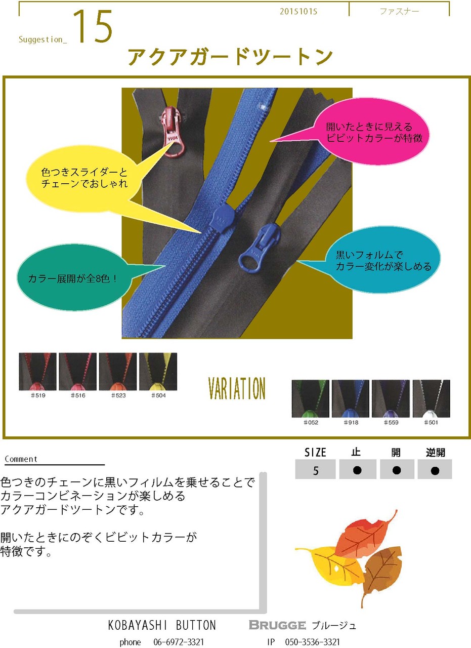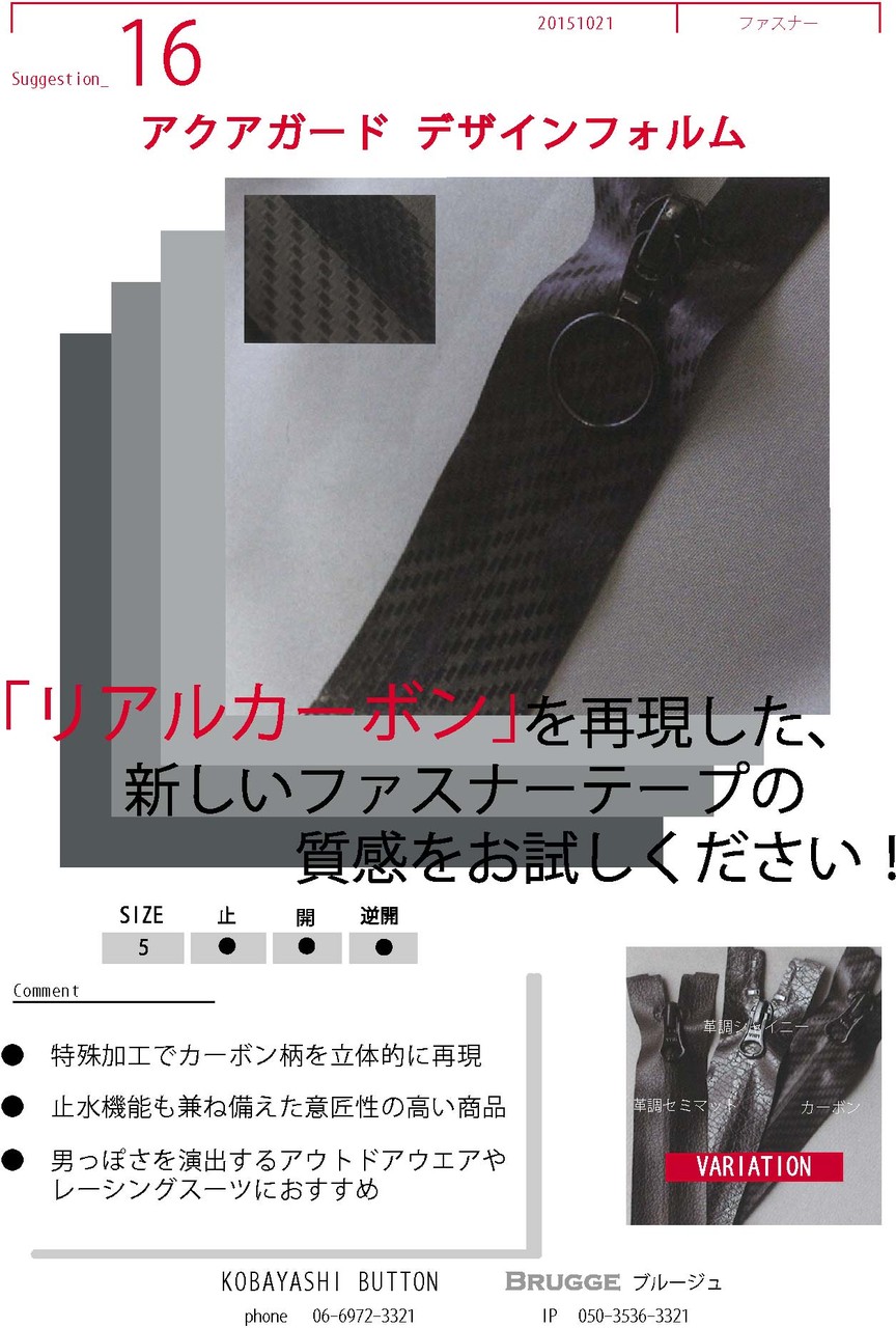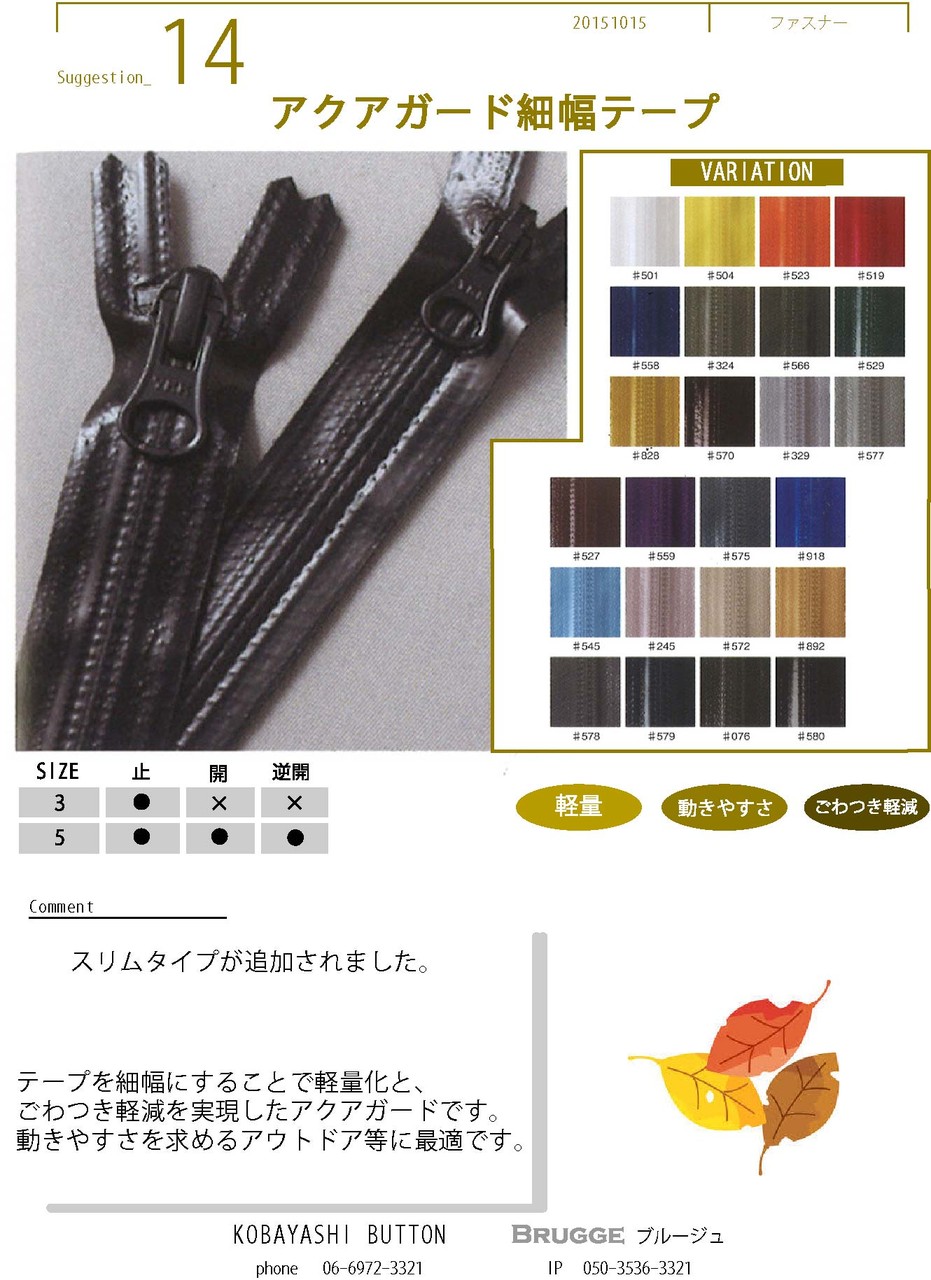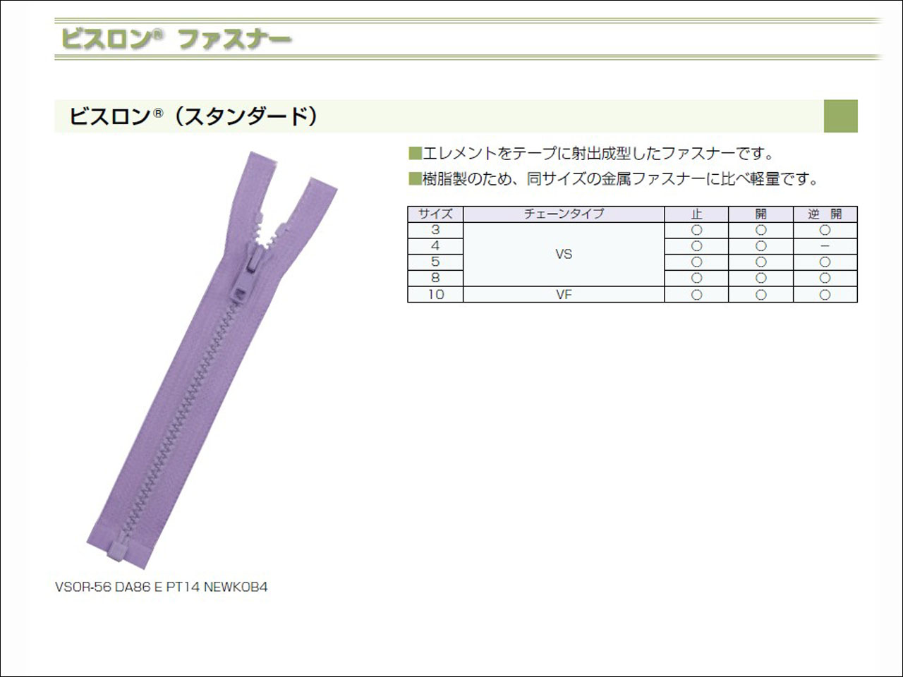 ビスロンファスナー: スポーツやアウトドア用途に選ばれることが多いです。軽量