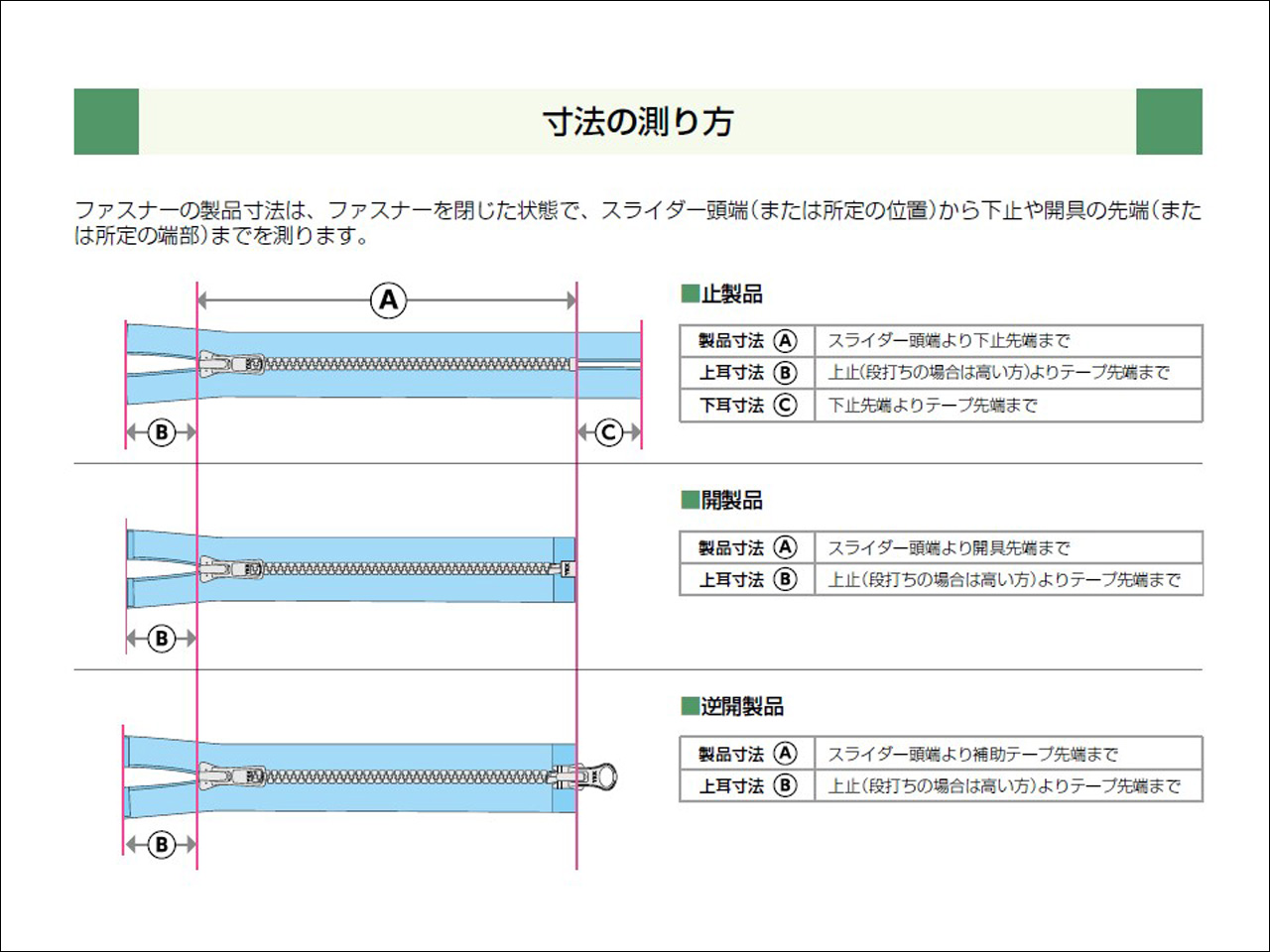 ファスナーの長さは ファスナーを閉じた状態でスライダー上端から下止パーツの下端までです。