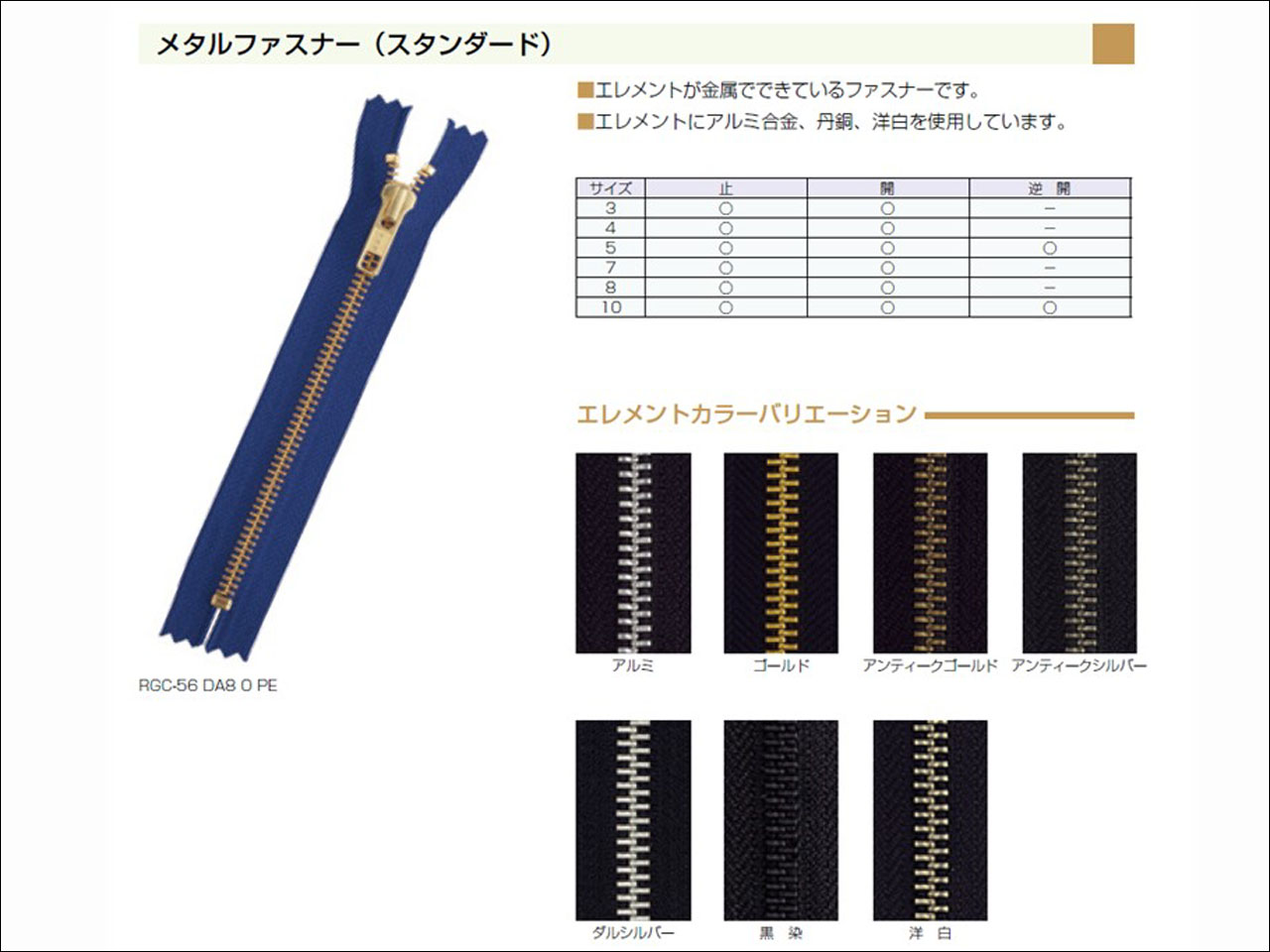金属ファスナー:ポーチなどの小物から 軽衣料 トップス ボトム アウターまで様々な用途に選ばれています。